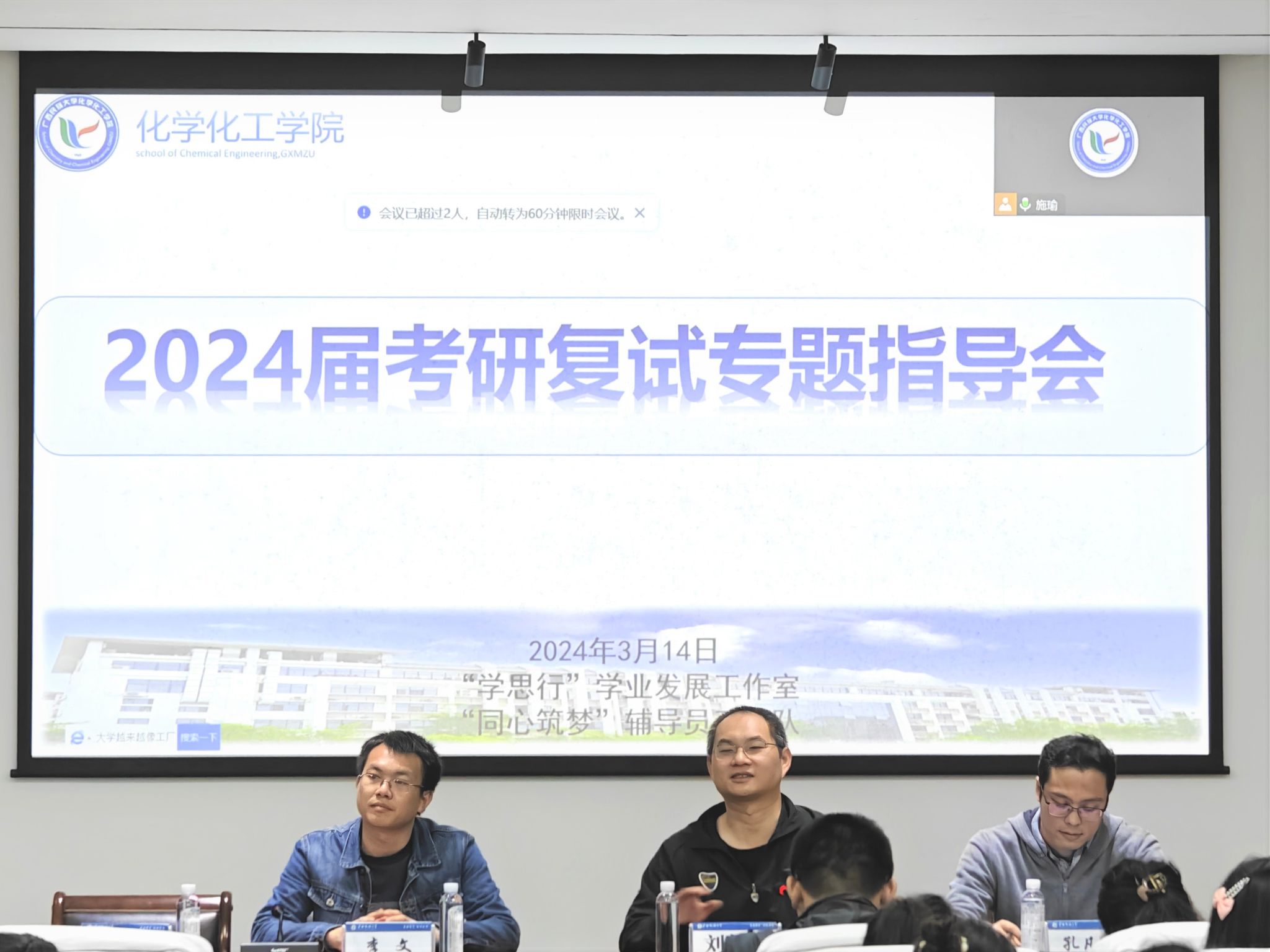 3月14日晚,为提高2024届毕业生考研复试成功率,必威西汉姆联在扬帆楼109会议室召开2024届考研复试专题交流指导会。学院副院长刘绍刚、化学系主任关一富教授、应用化学系主任李文副教授、化学工程与工艺系主任薛兴勇副教授、药学系主任孔凡栋副教授、毕业班辅导员施瑜及部分2024届考研毕业生参加。