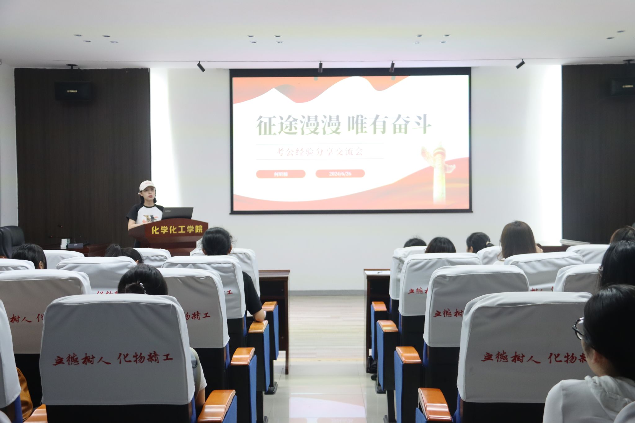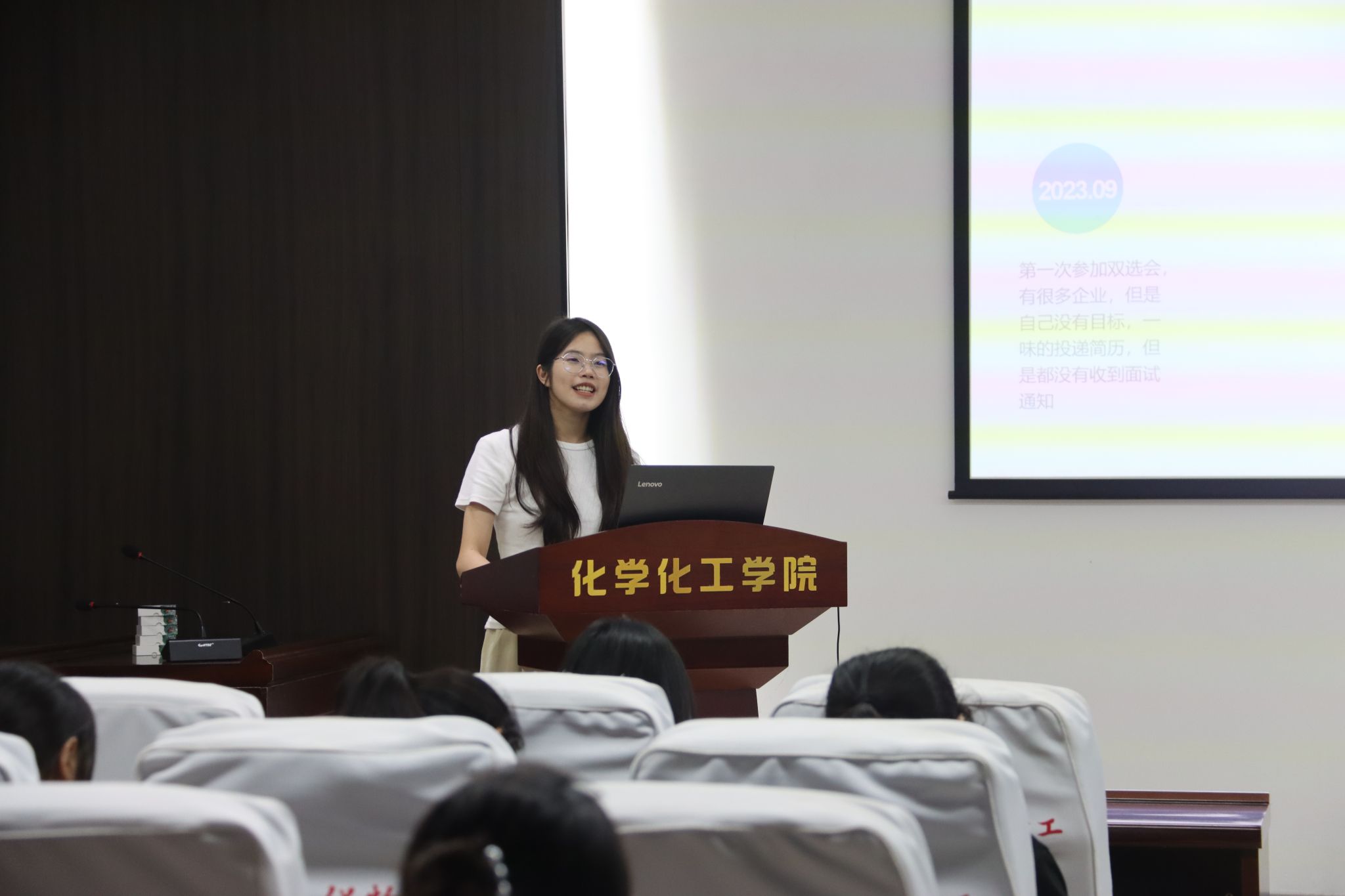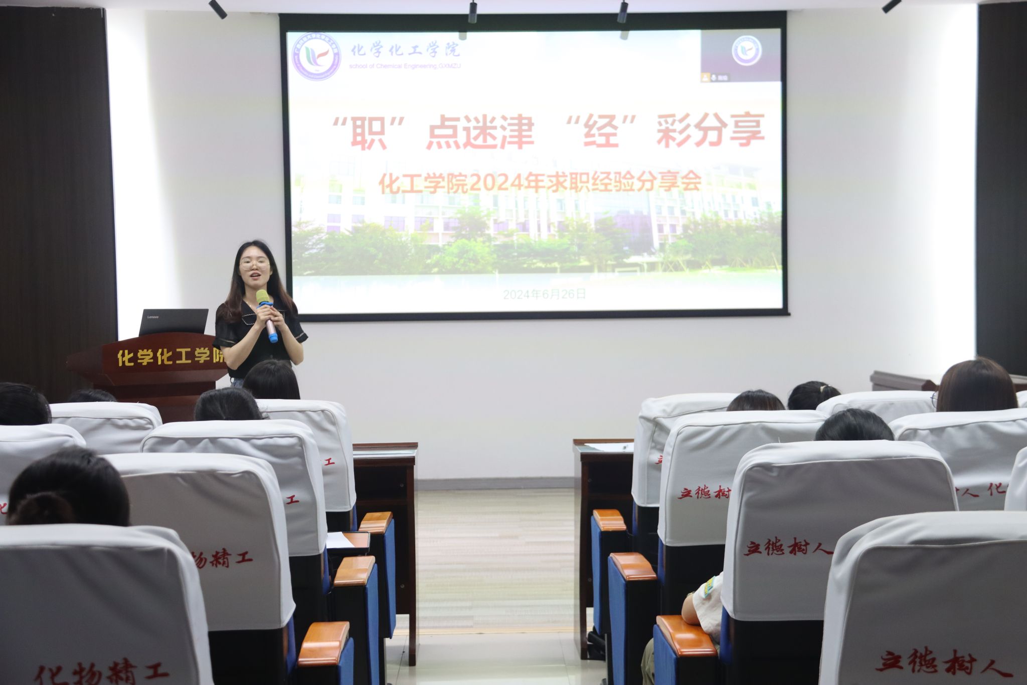 会上,成功求职的6位毕业生分别从简历的制作、笔试的准备、面试的细节、求职成功的契机等方面进行分享。其中,陈漫林表示,在应聘化学教师时,要提前准备好试讲,并且要对所面试的学校有所了解。韦怡表示面试前要提前做好自我介绍准备,对于面试官提出的问题,应懂得随机应变。何昕楠同学则分享了备考选调生的经验。