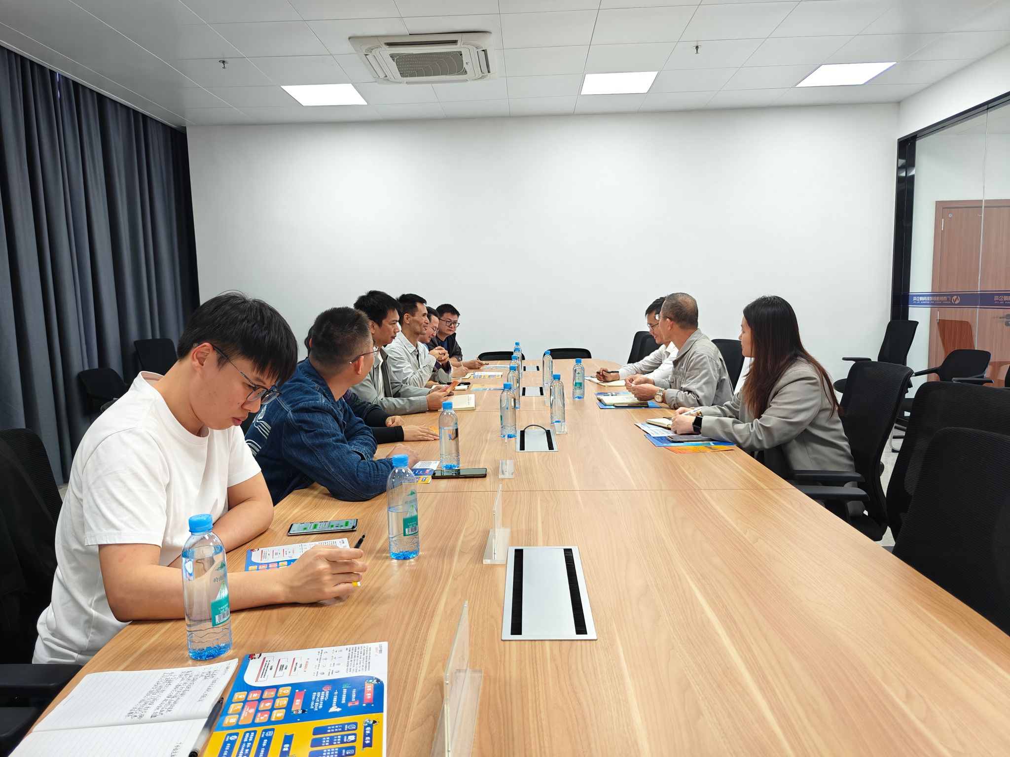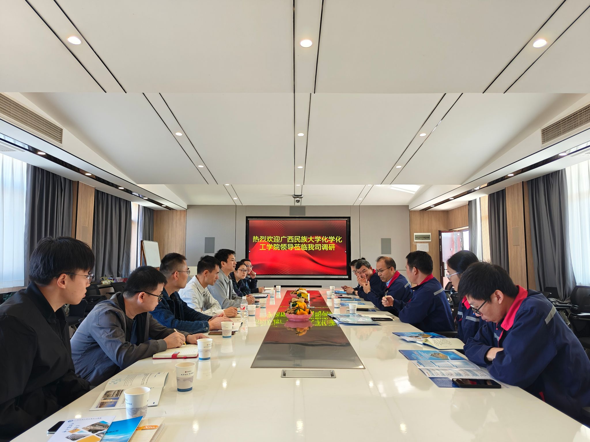 我院一行受到广西钦州志诚化工有限公司、广西恒逸新材料有限公司、广西自贸区宏坤新材料有限公司的热情接待。交流会上,企业方对学院来访表示欢迎,详细介绍公司的发展历程、主营业务、岗位需求及招聘计划等。黄钦和梁金禄则介绍了我院人才培养、专业特色及学生实习就业等情况。双方就就业、实习、产学研合作达成初步共识,共同探讨长期合作机制。
