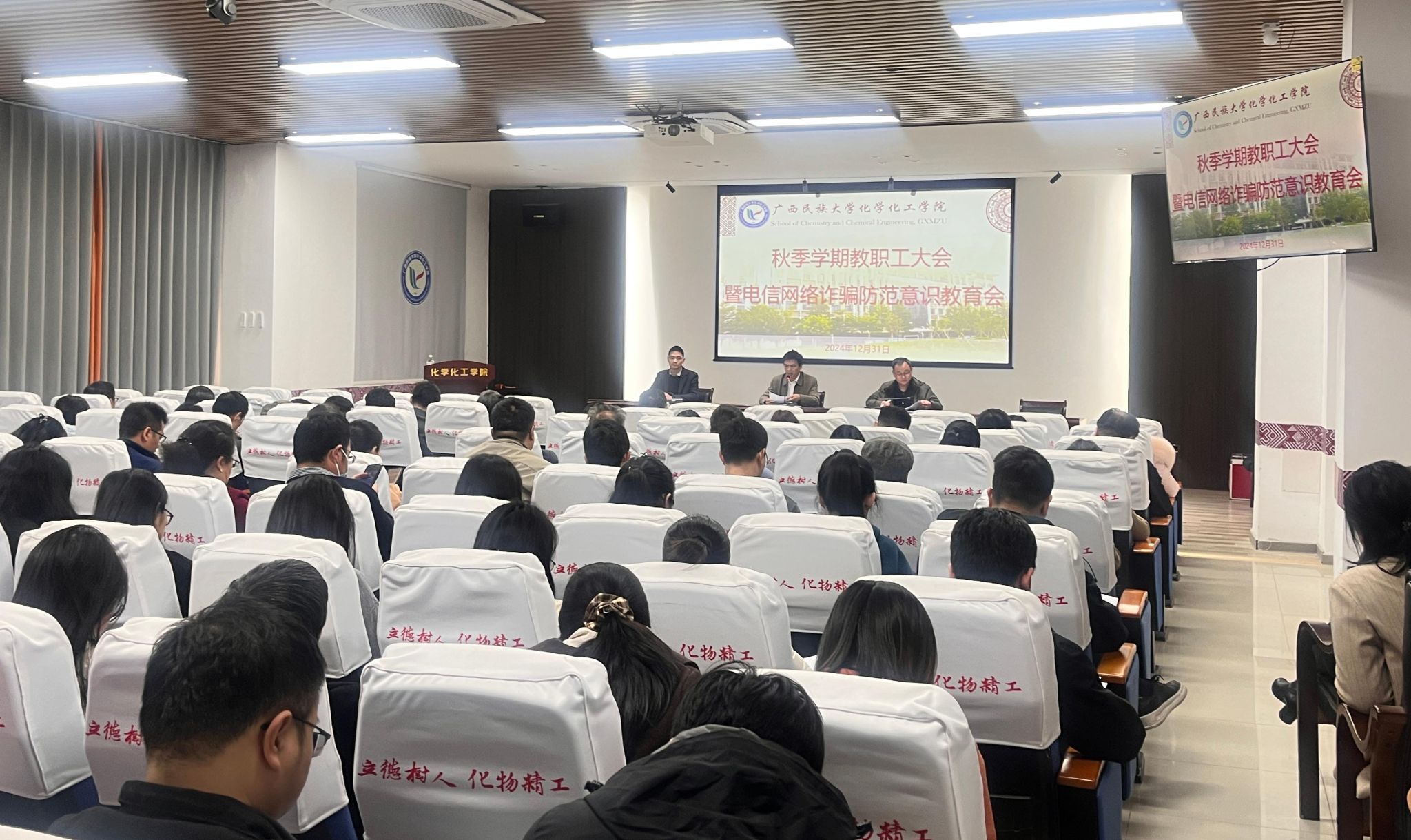 电信网络诈骗防范意识教育会上,黄钦结合我校教职工被电信网络诈骗的典型案例对我院全体教职工开展警示教育,并号召师生了解最新的诈骗手法,加强防范。