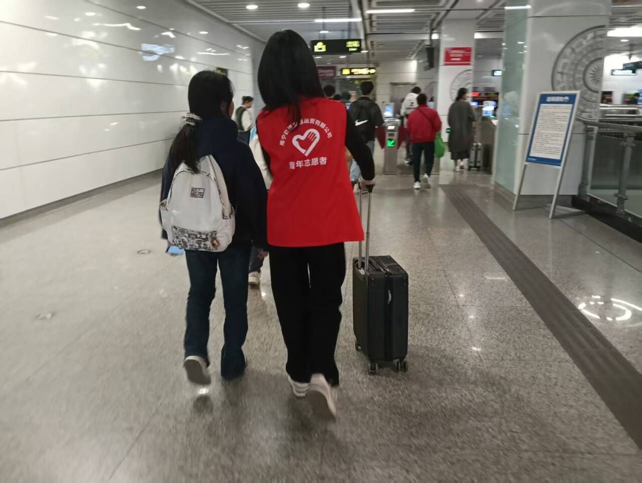 活动期间,志愿者们分工明确、协作有序。售票机旁,他们耐心指导乘客购票,尤其关注老年乘客,帮助其操作购票设备;安检口处,协助工作人员检查过机的行李,确保通行效率;通道内,指引乘客快速通行,避免拥堵。