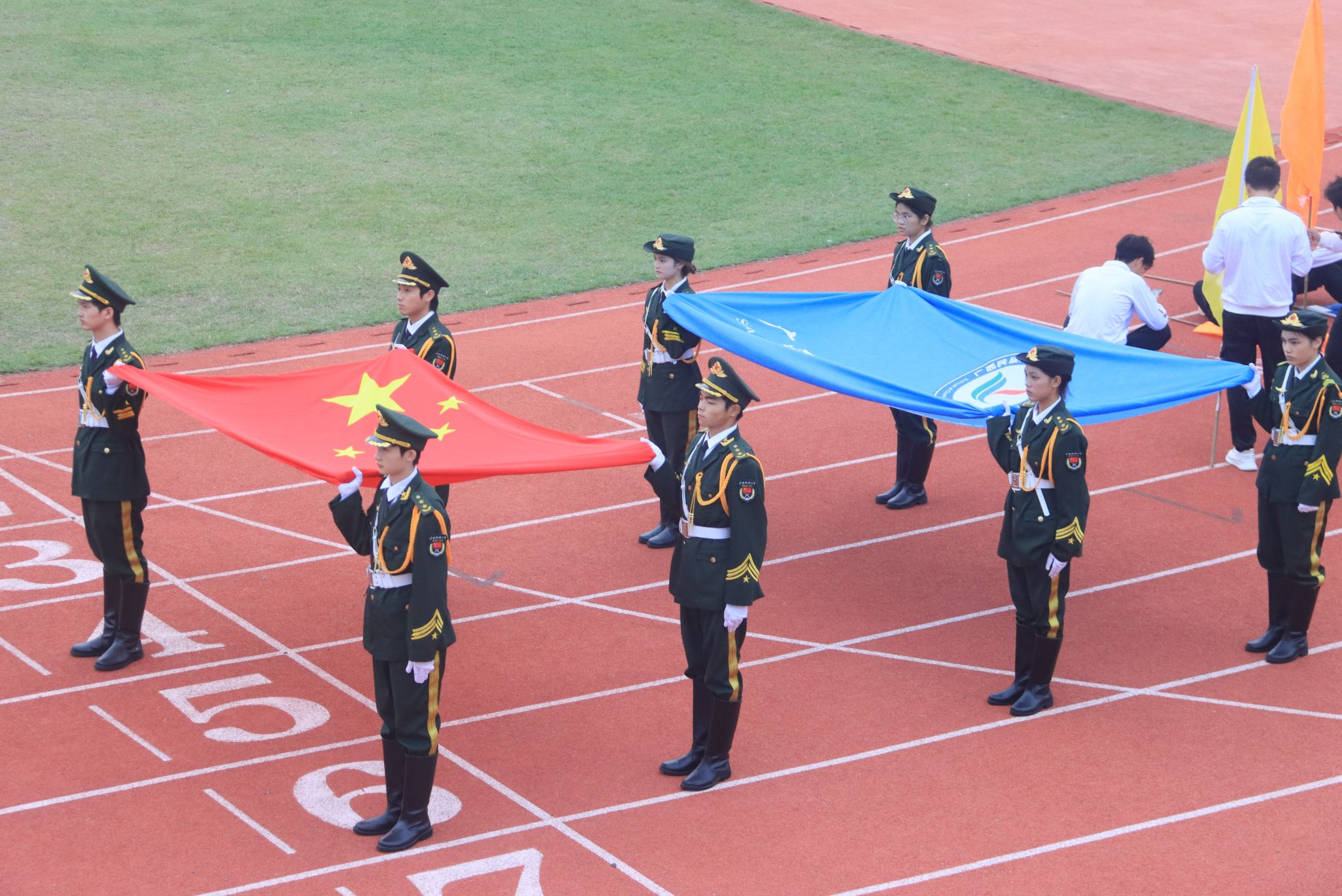 运动会开始,各方阵代表队踏着整齐的步伐有序进场,开幕式在拉拉队舞动的旋律与嘹亮的国歌声中正式开始。运动员代表黄恒烨同学上台宣誓,裁判员代表韦彦仟同学介绍裁判员具体工作,并立下维护竞赛公平的誓言。
