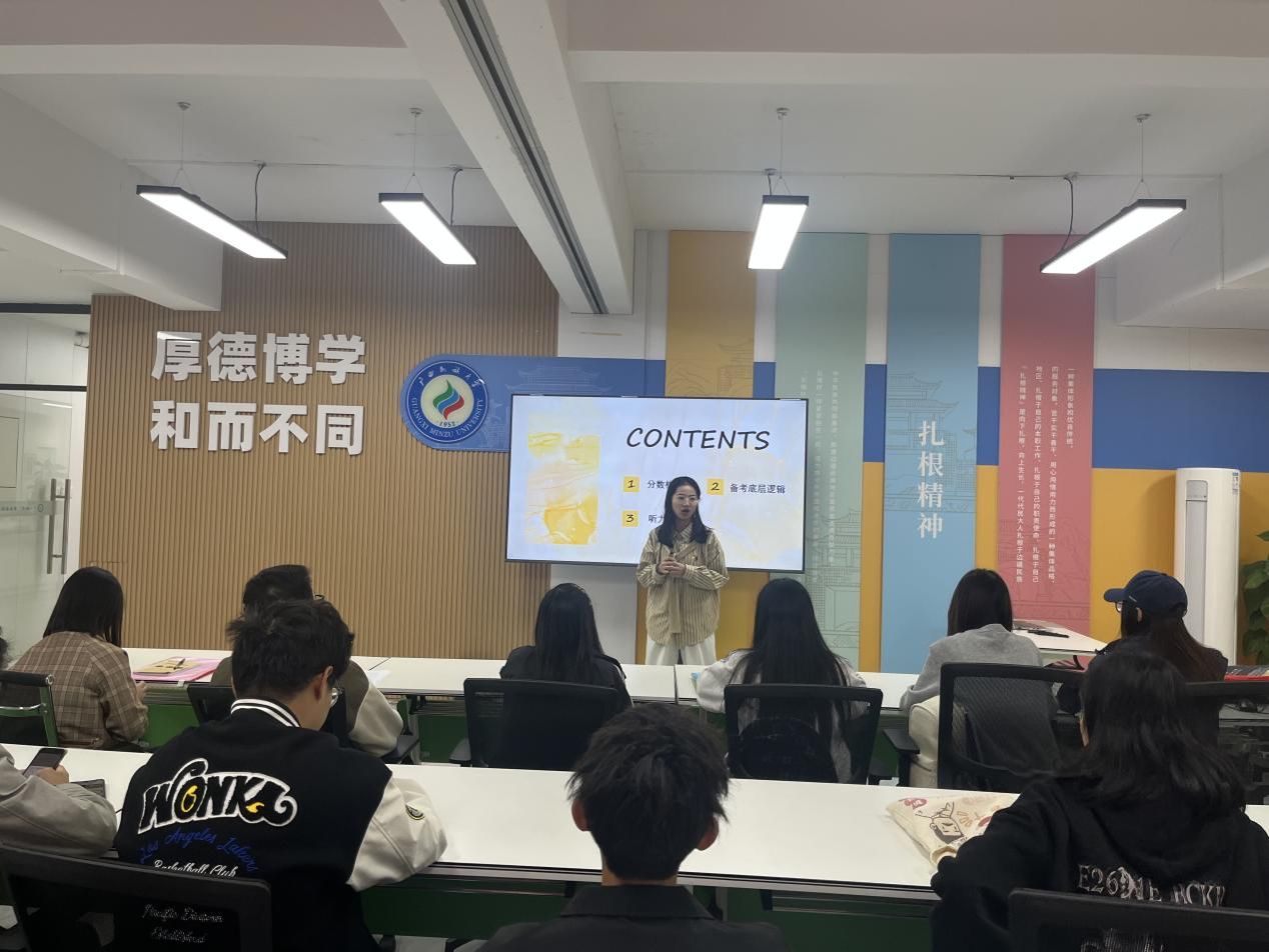 会上,来自外国语学院的分享嘉宾们从专业学习者视角,系统剖析了四六级考试的题型规律、备考策略与高分技巧,内容涵盖听力精练、阅读速解、写作提升与翻译地道表达等核心环节。他们结合自身学习经验,将语言习得的科学方法与应试策略深度融合,为在场同学带来了一场既有理论高度又极具实操性的精彩分享。在互动答疑环节,同学们踊跃提问,气氛热烈,展现了跨学科学子积极向上的精神风貌。